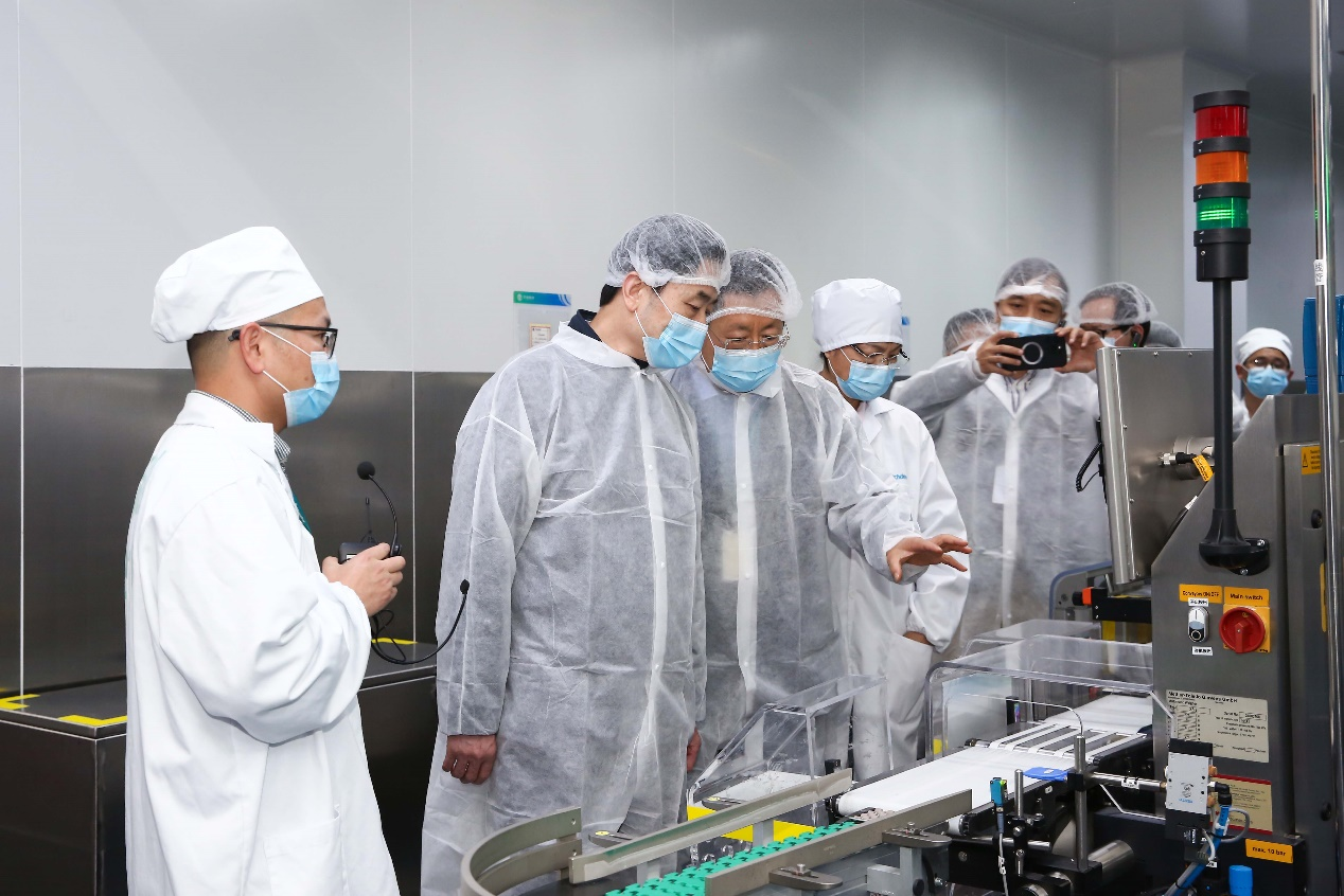 ▲甘霖书记实地参观ag真人平台官方依诺肝素钠制剂车间,听取董事长李锂介绍生产工艺与质量体系